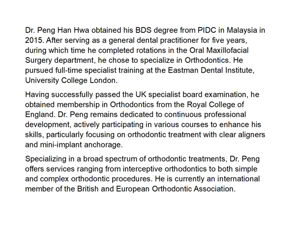 NEWS FLASH! We are excited to let you know that beginning June 2024, we have a new orthodontist, Dr Peng Han Hwa, joining our team. Dr Peng did his orthodontic training at the prestigious Eastman Dental Institute, UCL. He brings a wealth of knowledge on the latest in orthodontics to KOSDC. Welcome Dr Peng!                                     CV